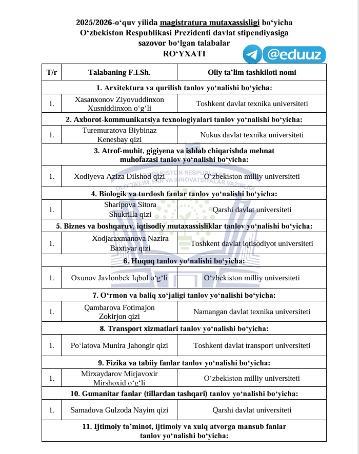 2025/2026-o‘quv yili uchun magistratura mutaxassisliklari bo‘yicha Prezident stipendiyasi g‘oliblari e’lon qilindi